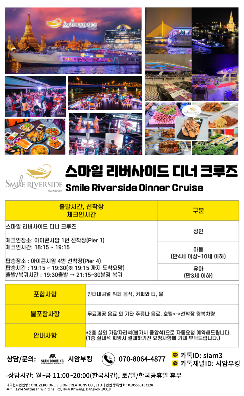 탑승 전, 19:15 시까지 아이콘 시암 1번 선착장(Pier) 스마일 리버사이드 체크인 데스크에서 체크인 후 4번 선착장에서 탑승을 기다려주세요.
